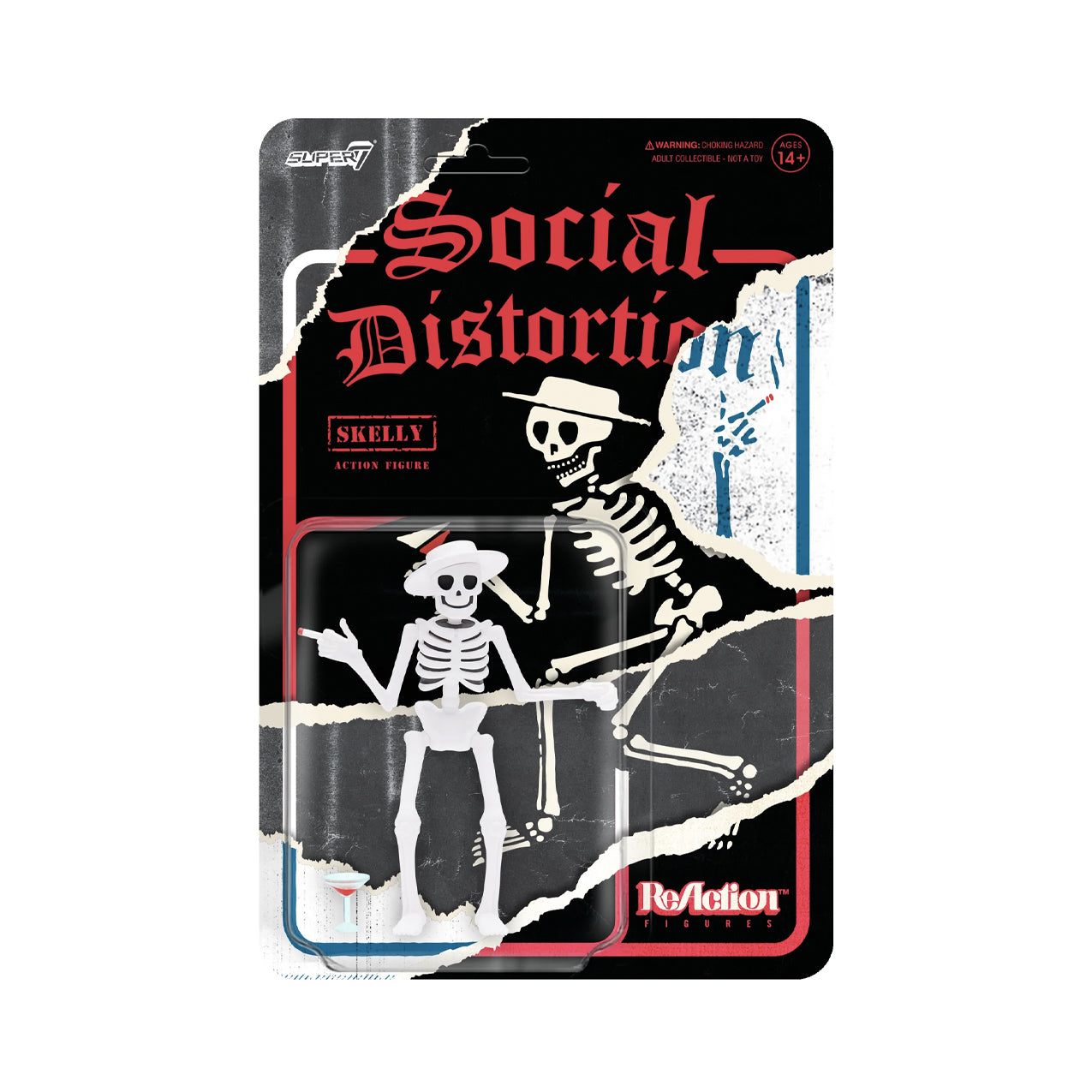 Join the punk rock party with the iconic mascot of Social Distortion, Skelly! This 3.75” articulated Social Distortion ReAction figure of Skelly features the jaunty skeleton with trademark hat and cigarette as well as martini glass accessory. He’s as timeless as the band itself and the story of your collection won’t be the same without the Social Distortion ReAction figure of Skelly!